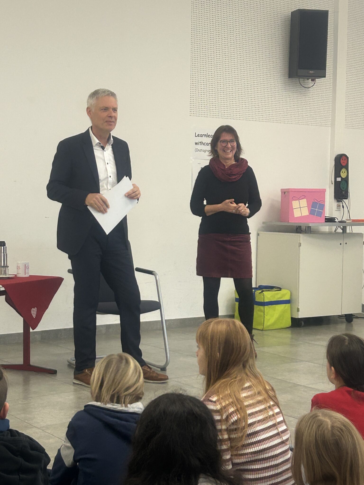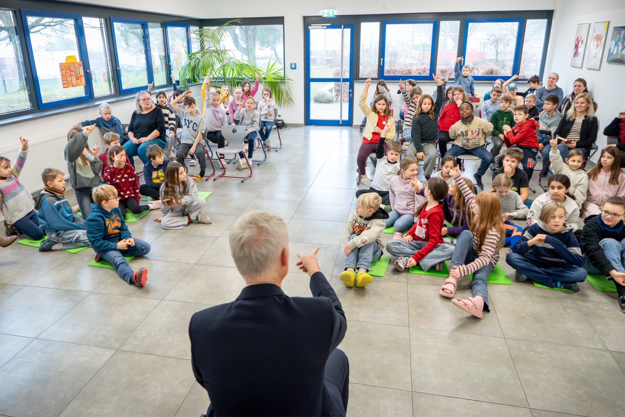 Die Schulleiterin Anette Schliebener eröffnete die Veranstaltung mit einer herzlichen Begrüßung und hieß Dr. Lösel willkommen. Die Aufregung war den Kindern anzumerken, die gespannt auf das warteten, was kommen würde. Herr Dr. Lösel nahm sich die Zeit, um einige Fragen an die Schüler zu stellen. „Wo kommt ihr her?“ und „Was macht eure Schule besonders?“ waren nur einige der Themen, die er ansprach. Es war bemerkenswert zu sehen, wie die Kinder aufblühten und begeistert von ihren Hobbys und ihren Erlebnissen berichteten.